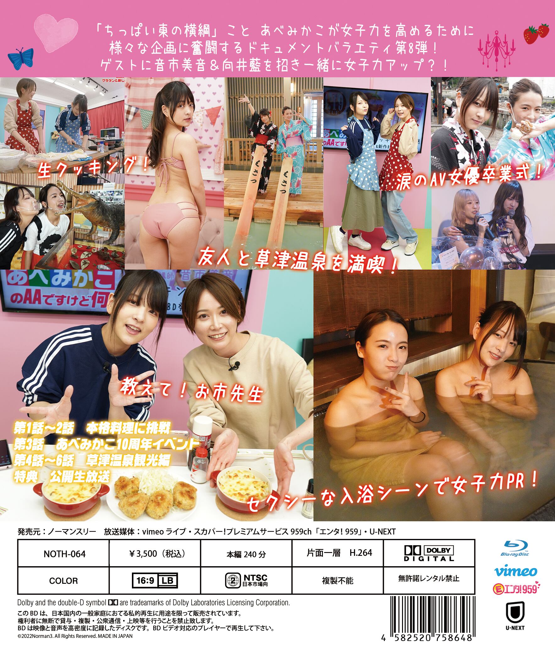 元AV女優YouTuber・あべみかこが女子力を高めるために様々な企画に奮闘するドキュメントバラエティBD第8弾。ゲストに音市美音&向井藍を招き一緒に女子力アップ?!